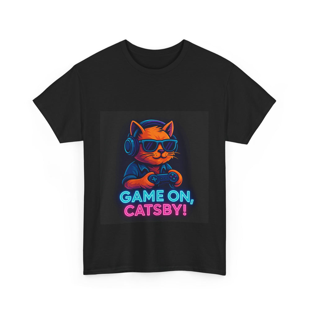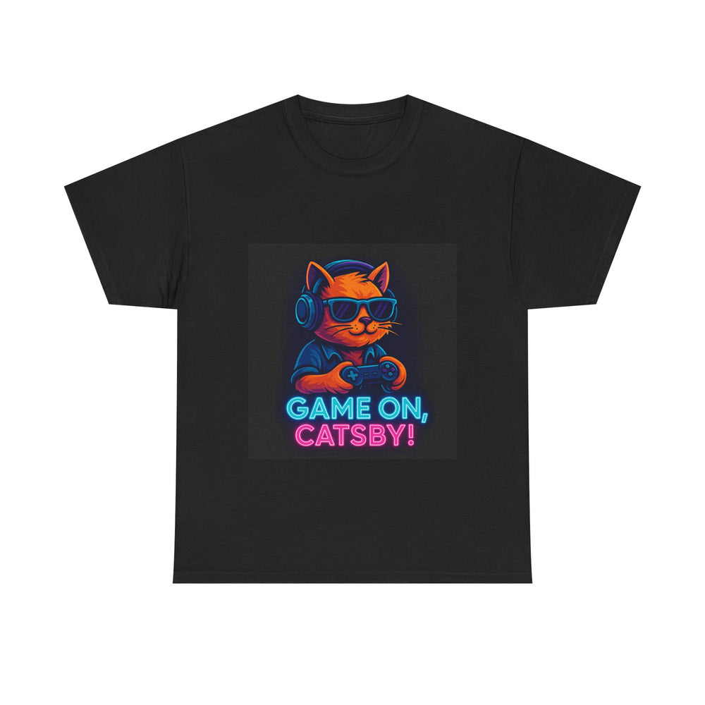 Level up your style with our Game On Catsby T‑Shirt! This fun design features a neon cat wearing headphones and shades, clutching a video game controller and the phrase "GAME ON, CATSBY!". Perfect for gamers and feline fans alike, the high‑quality cotton tee offers comfort and makes a bold statement.