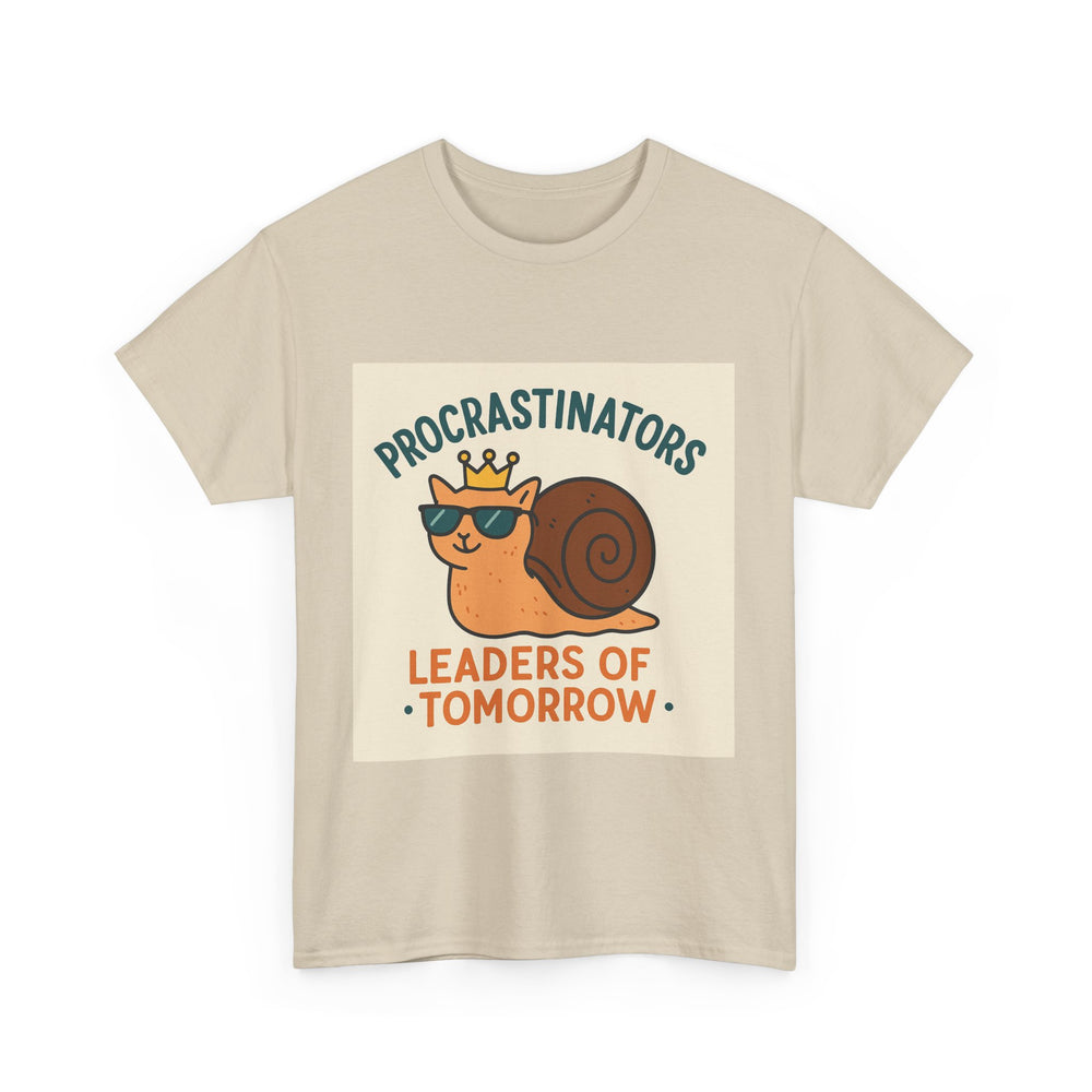 Embrace your inner procrastinator with our Procrastinators: Leaders of Tomorrow T-Shirt. This playful design features a laid-back snail wearing a crown and sunglasses alongside the humorous slogan "Procrastinators: Leaders of Tomorrow." Printed on a premium unisex heavy cotton tee, it offers a relaxed fit and soft feel that's perfect for everyday wear. Available in a sand color to complement the design and in sizes S–3XL.